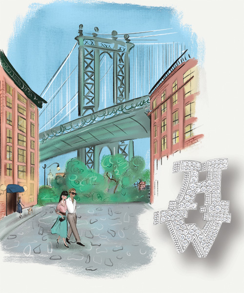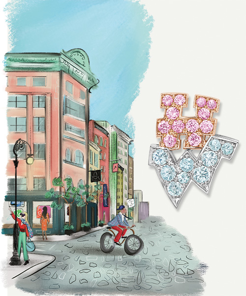 While the diamond remains central, color plays a decisive role. Compositions in pink sapphires and diamonds, or blue sapphires and diamonds, introduce contrasts reminiscent of the neon lights and chromatic facades of Manhattan. The "HW" brooch in pink sapphires and Paraíba tourmalines evokes the SoHo art scene, its galleries, and its creative energy. This chromatic dimension transforms the jewel into a fragment of the urban landscape, like a precious map of New York.