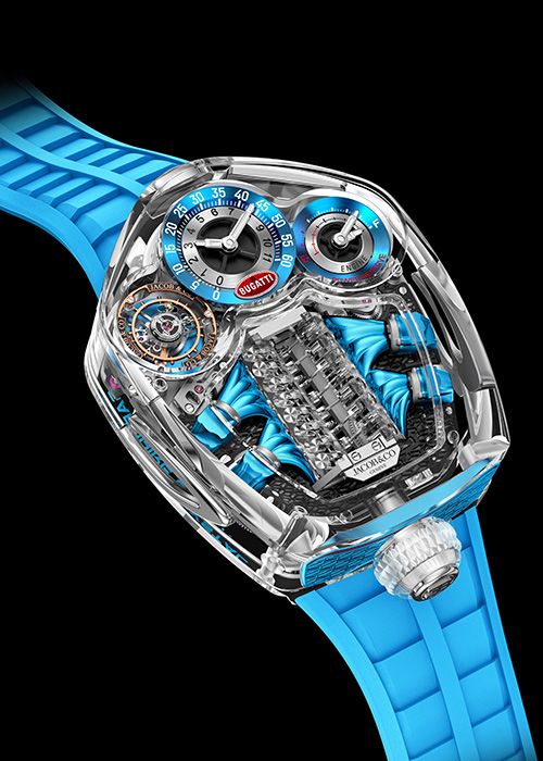La Bugatti Tourbillon Sapphire Crystal ne se contente pas d’évoquer l’automobile, elle en transpose les codes mécaniques et esthétiques.