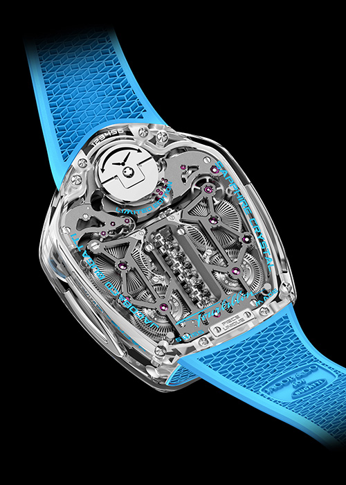Cette approche transforme la montre en objet presque immatériel. Rien n’est dissimulé. Chaque composant, chaque interaction mécanique devient visible, comme si l’on observait le cœur d’une hypercar à nu.