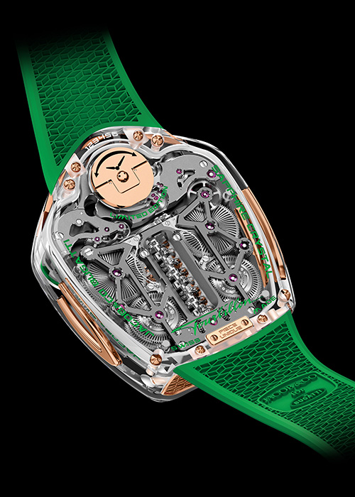 L’ADN de la marque repose sur une fusion entre exubérance esthétique, innovation mécanique et culture de la performance, donnant naissance à des pièces hors normes où la complication devient spectacle. Tourbillons multi-axes, automates animés, architectures tridimensionnelles : chaque montre est conçue comme une démonstration technique autant qu’un objet émotionnel. À travers ses collaborations, notamment avec l’univers automobile ou l’aéronautique, la maison s’inscrit dans une logique de dépassement constant, revendiquant une vision du luxe où l’exclusivité se conjugue avec une forte dimension visuelle et narrative.