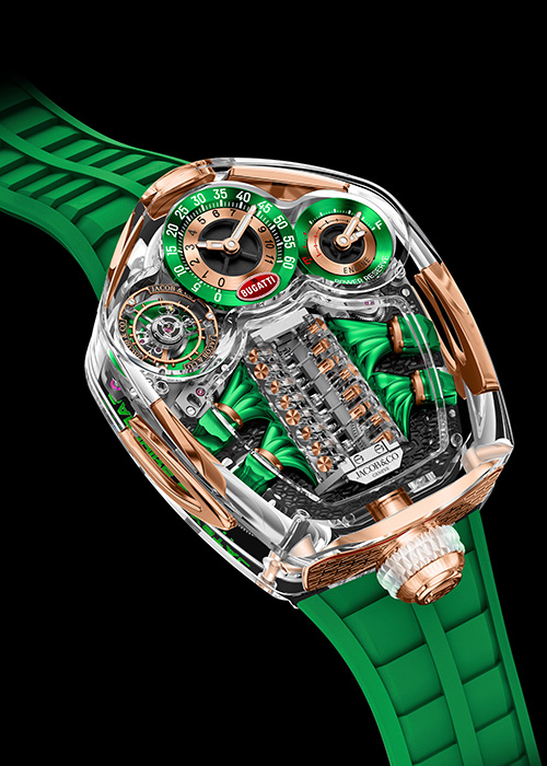 Son calibre JCAM55 adopte une architecture inspirée du moteur de l’hypercar Bugatti. Au centre, un automate reproduit un bloc moteur V16, entièrement visible grâce au boîtier transparent.