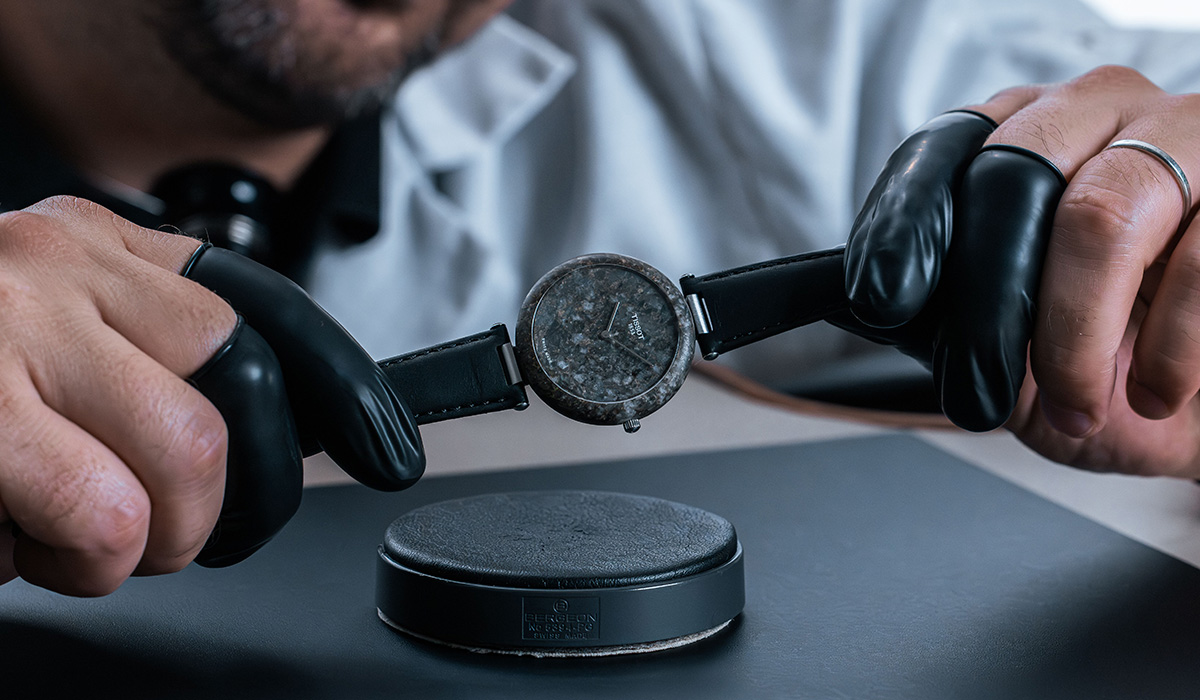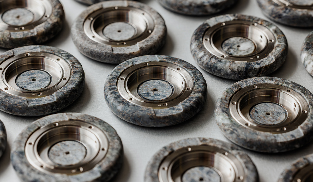 Chaque boîtier est poli et travaillé avec une précision millimétrique, afin d’offrir une surface lisse tout en conservant la texture brute de la roche. L’intégration du cadran dans la pierre, sans rupture visuelle, accentue l’impression que l’on lit directement le temps dans la matière alpine.