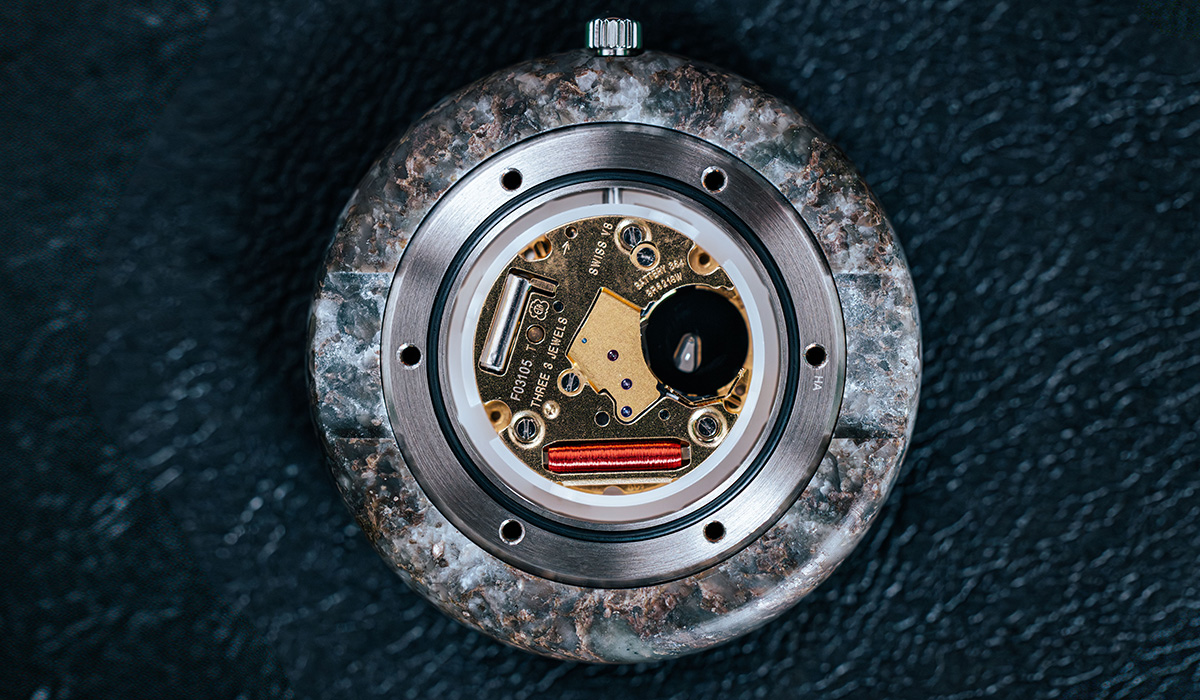 Sous cette apparente simplicité se cache un mouvement à quartz suisse. Léger, fiable et précis, il équilibre la densité du granit et permet à la montre de rester agréable au quotidien. L’absence de complications renforce la lisibilité et l’épure : heures et minutes suffisent à cette montre qui fait de sa matière la véritable complication.