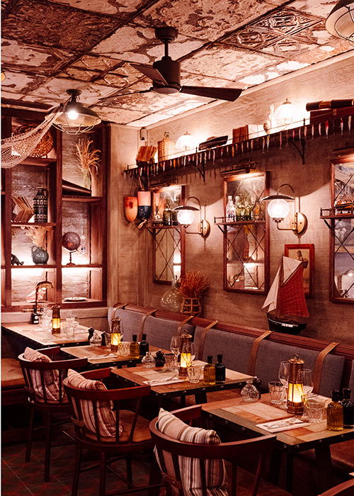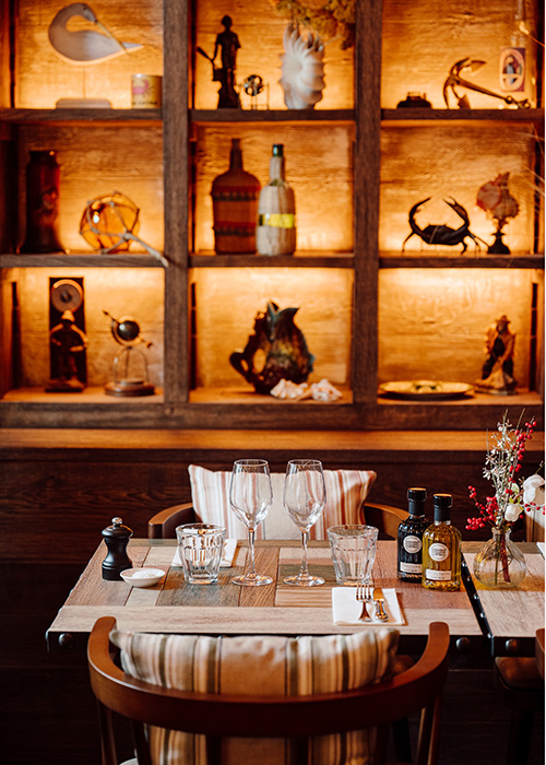 Dès l’entrée, le ton est donné. Une devanture vibrante avec un bar à huîtres qui donne envie de s’arrêter, et à l’intérieur, une mise en scène soignée par le designer Richard Lafond : velours doux, bois brut, filets de pêche, lampes rétro, bibelots marins… Le charme opère tout de suite. On est à Paris, mais on s’y sent comme sur la côte.