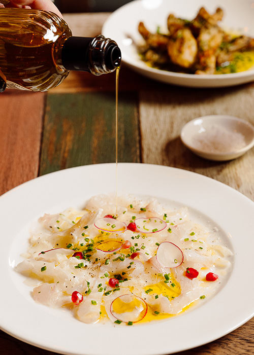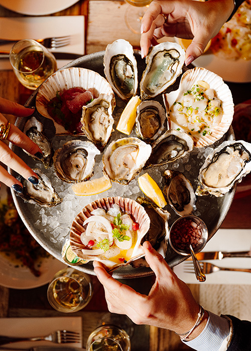 La mer est reine, mais sans protocole ni cérémonial. La maison travaille en direct avec des pêcheurs et producteurs indépendants, en respectant les saisons. La carte aligne une dizaine de références d’huîtres sélectionnées avec soin – Gillardeau, Perles du Cap Ferret… et des assiettes qui font mouche : carpaccio de bar au fenouil, tartare de Saint-Jacques aux agrumes, avocat-tourteau, ou encore un club sandwich à l’araignée de mer devenu culte.
