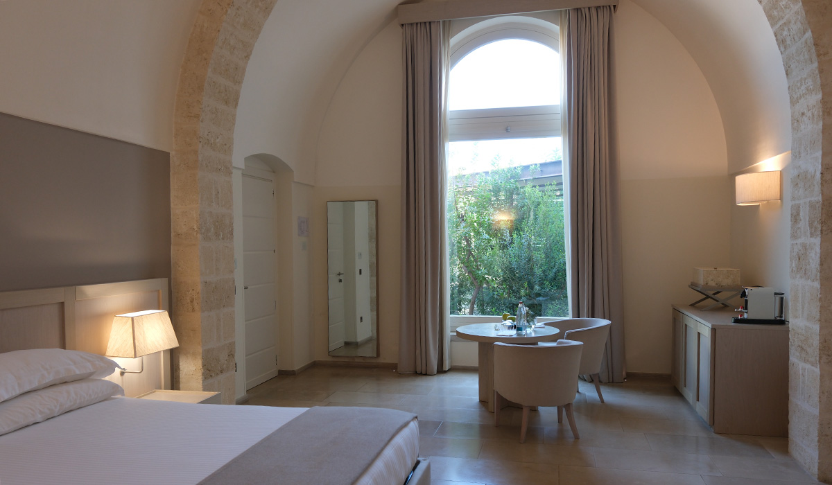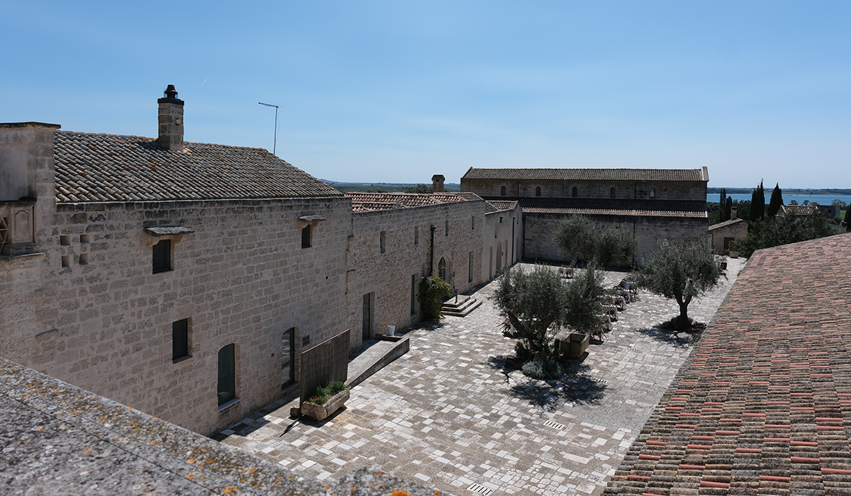 Même s’il impressionne par l’étendue du site, le Relais Histò***** conserve des dimensions humaines avec ses 48 chambres, dont 15 suites, mêlant le charme rustique de la tradition avec le confort moderne. L’établissement est né de la restauration d’une ancienne masseria du XVIIIe siècle – nom donné dans les Pouilles à un ensemble de bâtiments de ferme – découverte en 1994 par Giovanni Colomba – qui lui a redonné vie. Enfant du pays, profondément attaché à ses racines, lorsque Giovanni découvre les ruines de cette ancienne masseria oubliée, il décide d’investir 30 millions d’euros pour entreprendre une restauration titanesque qu’il réalise avec soin, dans le respect des pierres locales et des structures historiques. Face au bâtiment principal, une basilique romane du XIe siècle s’était effondrée. Elle n’avait plus de toit ni de sol ; une église plus petite avait même pris place à l’intérieur de la première et englobait les colonnes. Giovanni Colomba a consacré une douzaine d’années à sa reconstruction. Aujourd’hui, avec ses trois nefs, ses colonnes à nouveau dégagées et ses fresques médiévales, la basilique accueille mariages, concerts et célébrations.