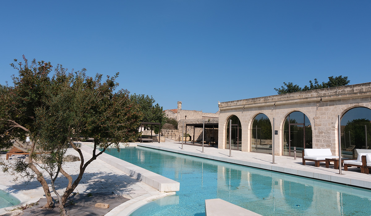 Dans les terres, cernée d’oliveraies, se détache la bâtisse du Relais Histò San Pietro, Hotel & Spa. Les propriétaires des lieux, Giovanni Colomba et sa femme Adriana, avec leur neveu Giovanni Colomba Junior, accueillent les visiteurs de manière à ce qu’ils soient considérés comme des invités de la famille. Ils veillent à ce que chaque hôte se sente attendu et reconnu. D’ailleurs, le personnel parle très bien français et s’applique à ce que l’hospitalité reste aussi sincère que discrète. Il nous conduit vers les neuf chambres du bâtiment ancien, à l’étage, dont certaines bénéficient d’une terrasse avec vue sur la cour et les champs, avec la mer Piccolo à l’horizon. D’une impressionnante hauteur sous plafond, les pièces sont spacieuses et voûtées. Elles sont équipées de mobilier contemporain aux lignes épurées, qui dialogue avec la pierre millénaire des lieux.