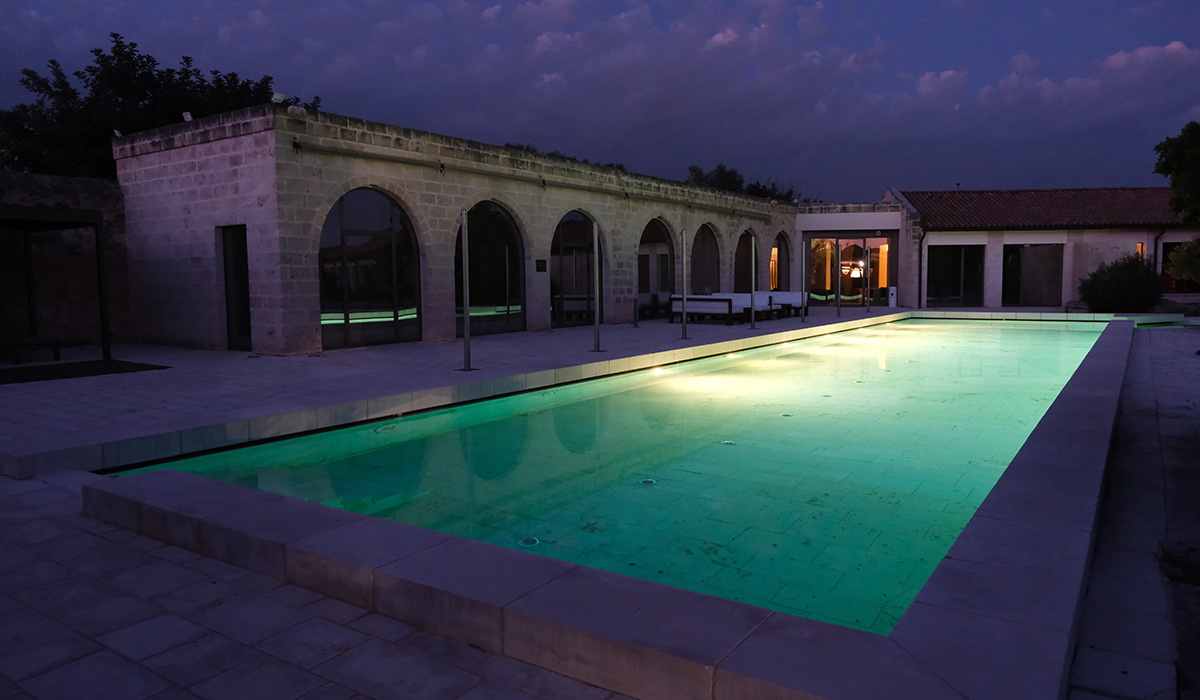 Derrière la basilique, un autre site a été préservé. C’était une ancienne carrière de pierres, qui a servi à la construction de la ville de Tarente. Les roches sont visibles autour de la vaste piscine extérieure qui conduit au spa. Inspiré des thermes antiques, le spa Culti, d’une superficie de 1 750 m², représente l’un des plus grands établissements du genre dans le sud de l’Italie. Il dispose d’une salle de sport, d’un sauna pensé comme une cabane avec vue sur le jardin, d’un hammam, de trois piscines intérieures d’eau chaude – dont une s’ouvre vers l’extérieur et se prolonge dans la roche -, de salles de massage pour une à deux personnes et d’un espace de repos. Sans oublier un ancien trulli, utilisé comme une escale afin de retrouver la température normale du corps après les bains chauds. Dans cet écrin contemporain du bien-être, l’eau, la pierre et la lumière s’allient pour régénérer le corps et l’esprit. Après deux heures de ce parcours sensoriel, nous avons totalement oublié le monde extérieur…
