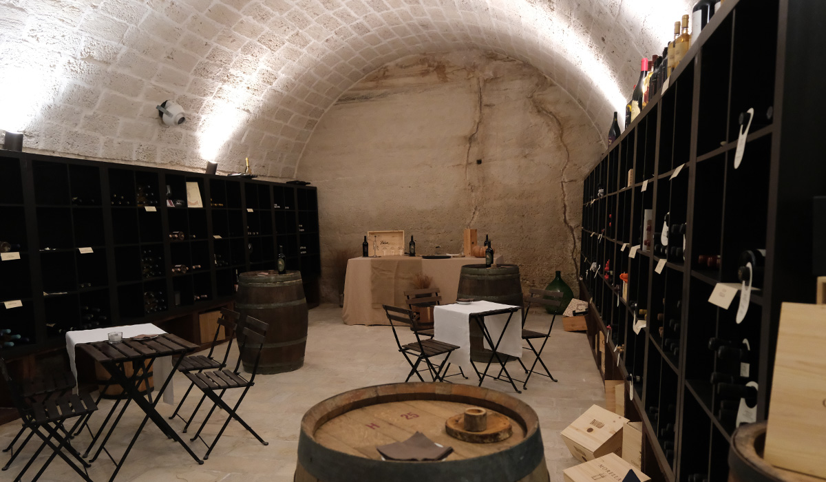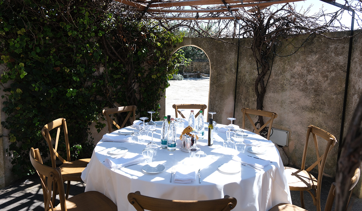 Le plat nous a ensuite été servi lors du déjeuner, accompagné de pain de campagne et assaisonné d’huile d’olive. À notre demande, la table a été dressée dans un tout petit bâtiment ancien, de forme octogonale, appelé l’Ottagono, sans portes ni toit, mais protégé du soleil par des branchages. Un moment hors du temps, avec un service à quatre mains délivré par un personnel aux petits soins. Les plats défilent, centrés sur une cuisine familiale et des spécialités des Pouilles, accompagnés par une sélection soignée de vins. Au sous-sol du bâtiment ancien, une magnifique cave voûtée conserve au frais les précieux flacons.